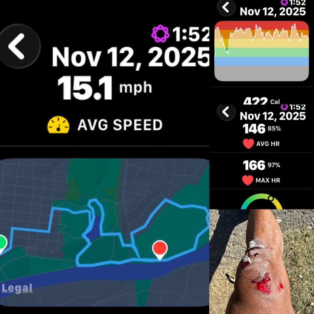 Until someone jumped directly in front of me & I crashed hard. Somehow I landed on my left side yet gashed completely my right knee