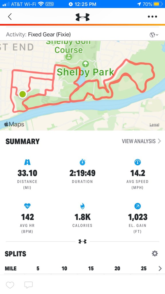 Since I’m having troubles in the new house getting proper resistance when switching out rear wheels, I went with 16 teeth on the heavy bike. My old Uphill Configuration but I planned on a very flat ride just to keep my legs confident. So naturally I ended up taking Frisbee Golf Hill four times in 32 miles – & each climb felt wonderful.