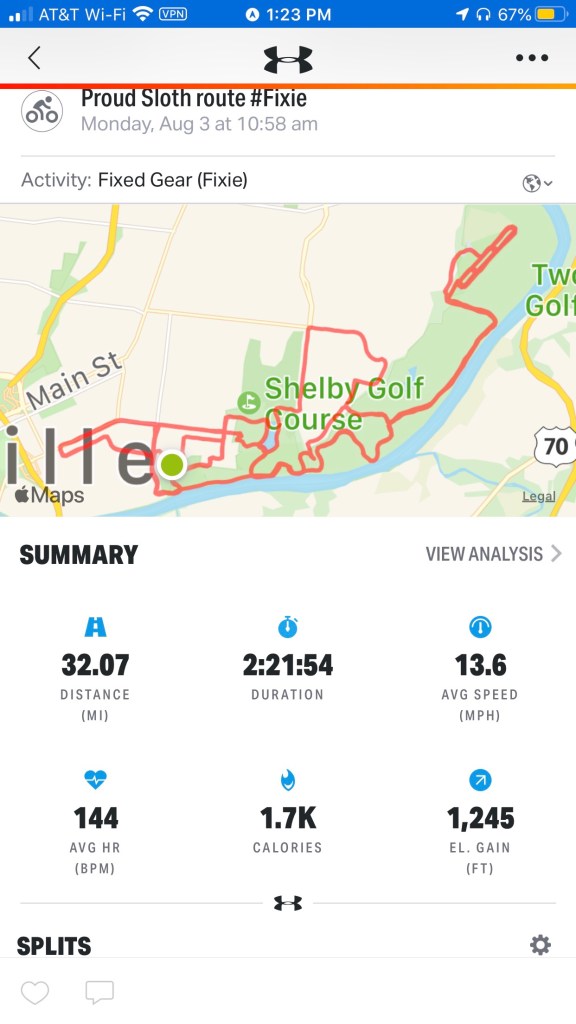 Worked the climbing gear today. Sevier went well plus the connection up Shelby – a lovely double – and up Frisbee Hill. Intentional 32 miles meant no Eastland but the tour of Tornado Acres showed some much-needed rebuilding.