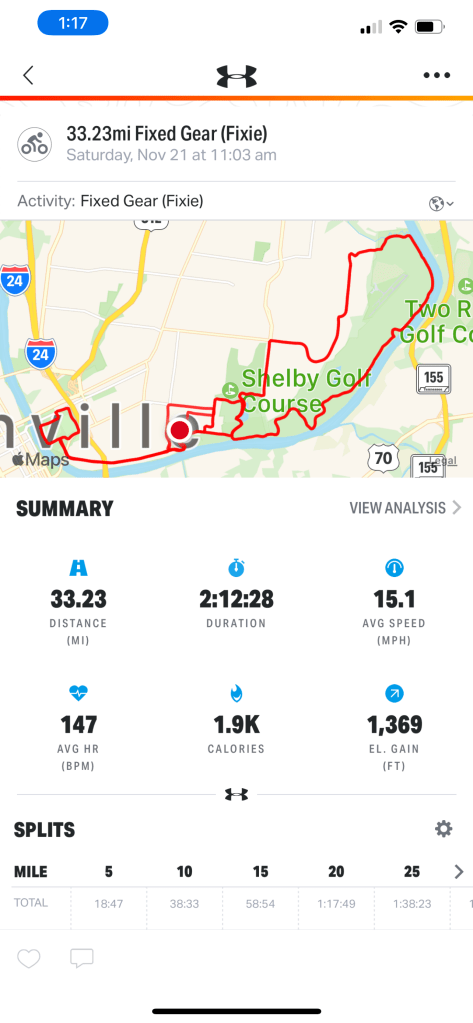 Light wind today & little traffic. For some reason most cyclists were headed in the opposite direction from me all day, tho I managed to pass 12 or so – 4 in a sprint on my final half-mile. Nearly 1300 feet of climbing along Rosebank & onto Eastland – a route I used to call the Spine.