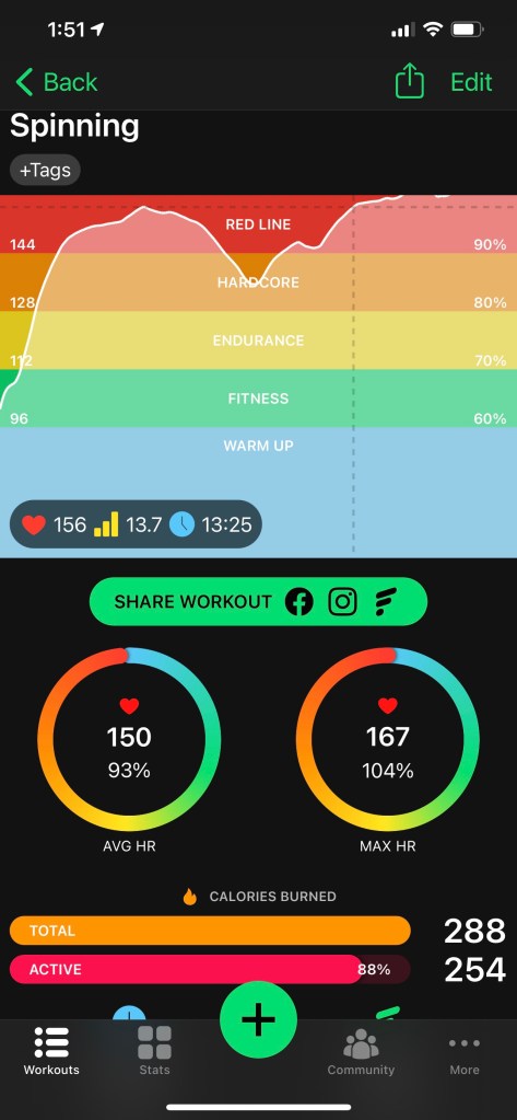 A short climb — 70 pedal-strokes som I’m 15 or so pedal-strokes stronger — and 100 pedal-strokes each on right leg & then left. I can hit 20 mph lefty and 16 righty. So I’m up at least 25 pedal-strokes.