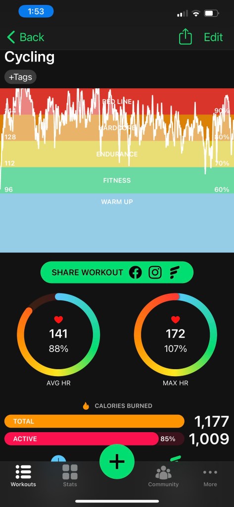 I was more than cautious at the start but I handled my first steep hill well enough — Aurora one leg at a time reaps benefits — & once I found a good rhythm things went very well. I don’t think I ever went faster over a mile than 15.6 mph but I’m calling my first ride a success.