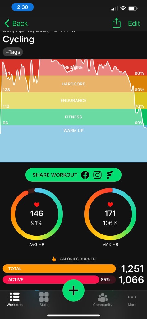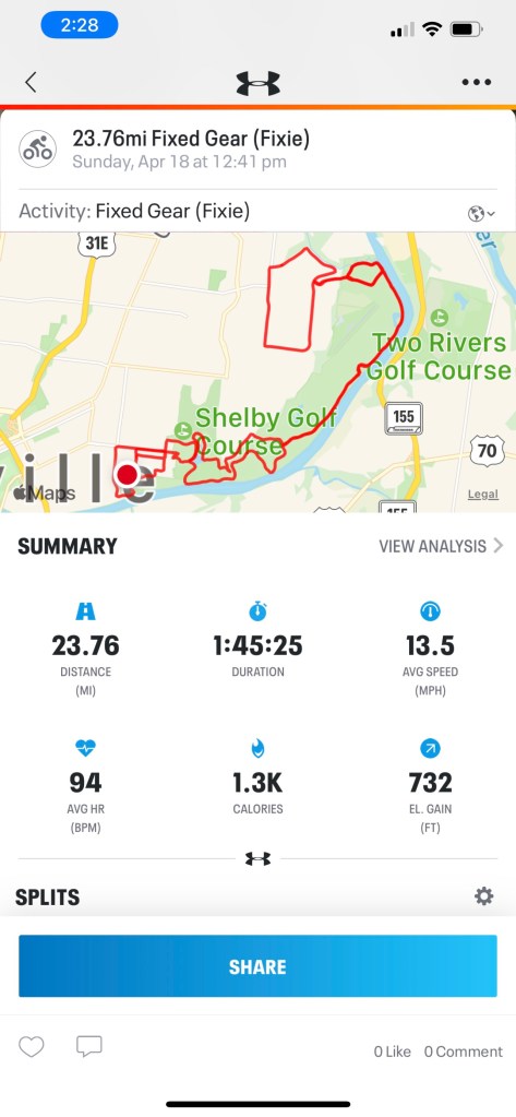 I fully expected to hit 31 miles today; when I took a right turn out of Shelby Bottoms to climb 5 hills I condemned myself to 23 miles but I got 732 feet of up out of them. Worth it. My left leg still does most of the heavy lifting but the right is getting stronger daily. I figure by July I’ll be ready for actual climbing.