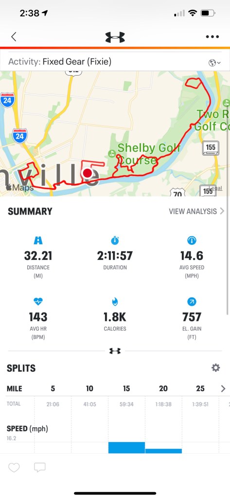 I did another adapted old Wednesday route with a Gravel detour due to more construction. I blew the simple math & could not get 2 laps done in 31 miles so I took a short way home. Legs feel good & only slightly fatigued.