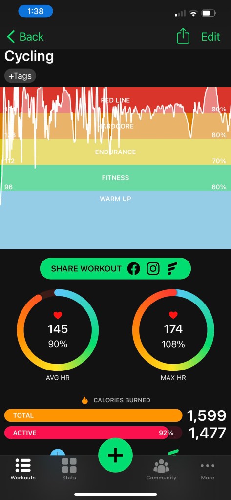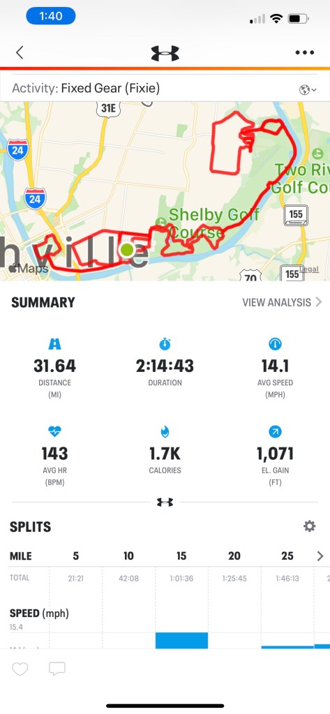 I tried a slight saddle-adjustment & took on some of the hills on Shelby’s extremities like it was Saturday. The legs feel good; I really must have dedicated sprinting days again tho.