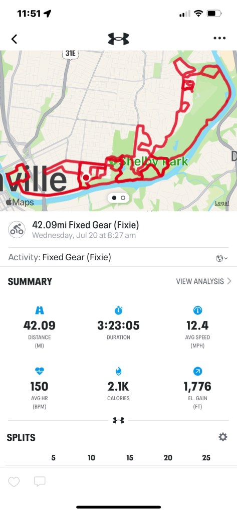 I climbed every hill available but 3 and hit 1776 feet of Up over 42 miles. I did not have those 3 final miles in my legs but it’s only July.