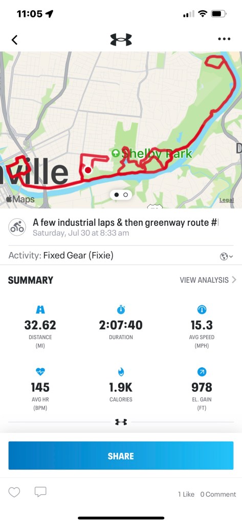 I took Amabo out today. She’s my first One-Speeder & also my first Fixie. She’s heavier & stiffer than Mr Tib and she rigged at 43 in the front & 15 in the rear which can be a very comforting ratio.