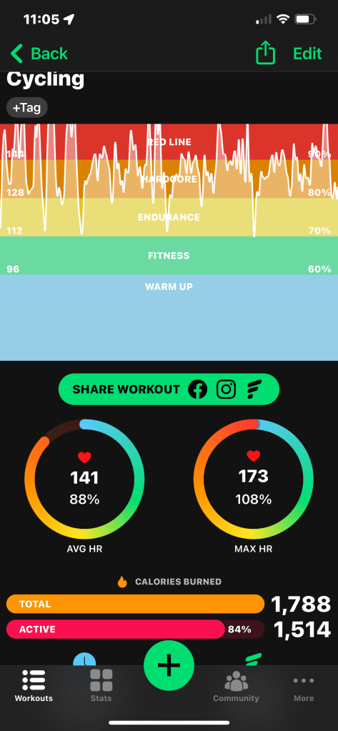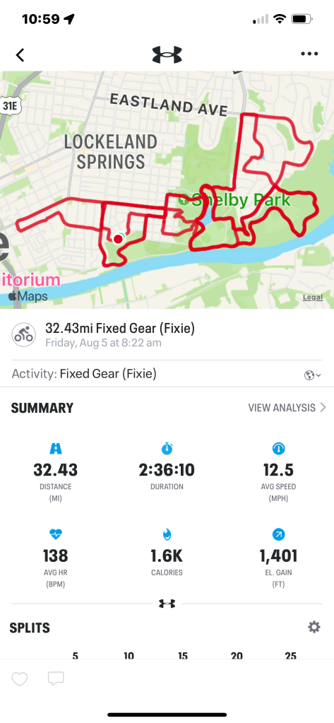There was no way to circle Me Sad Field today with all the Indy Car action, so I climbed some hills — including Newhall Road again — and tried some wrong-gear sprints. I cd hold 14.8 mph to catch a few other cyclists out there.