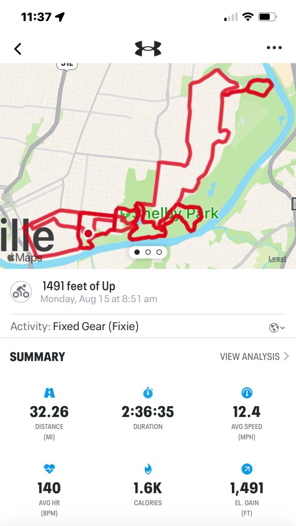 I was aiming at Front-Loading Shelby Hills (6 hills) and then taking Rosebank to the park and coming home up Preston. Tagging on Eastland and Electric was a good challenge at the end. Plateau Pedaling helps. 1608 feet of climbing but probably more went un-recorded. AppleWatch is notoriously under nuanced.