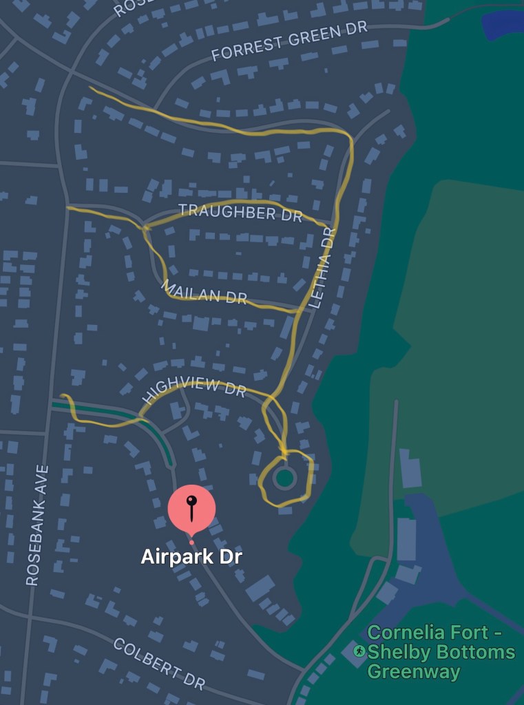 You actually gotta be there but near the Well Of Lycopolis entrance to Shelby Bottoms there are 4 streets which lead to the same cul-de-sac uphill endpoint [the Cherry On Top]. I have been riding those streets at 25 mile-mark of Monday rides for a few months, but never until today had I achieved 4 Cherries. The Cherry route is particularly steep on weary legs.