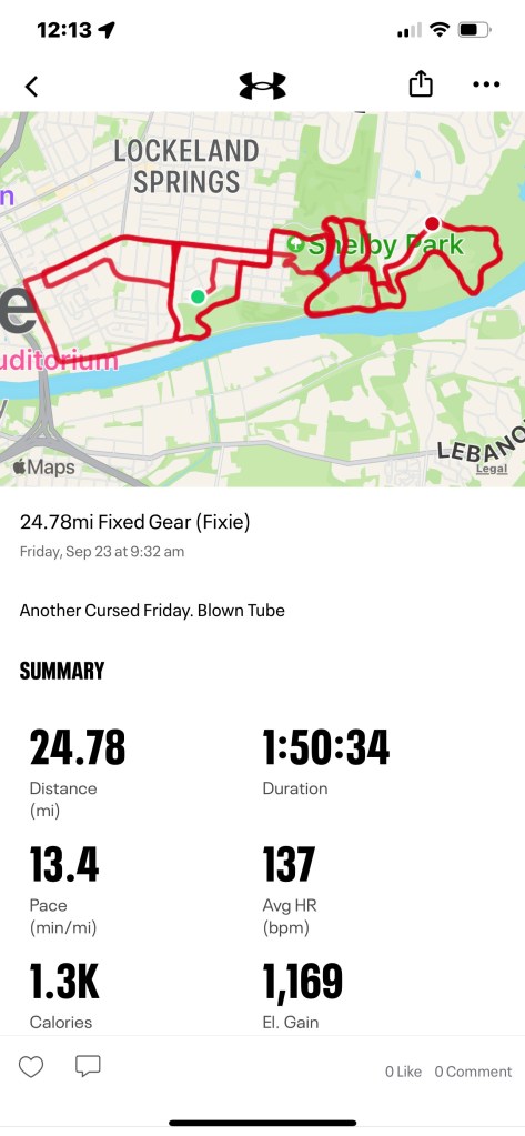 25 miles in I lost a tube my thumbs no longer let me break-down tires so I walked to my ride & got a new tube. A good 25 though.