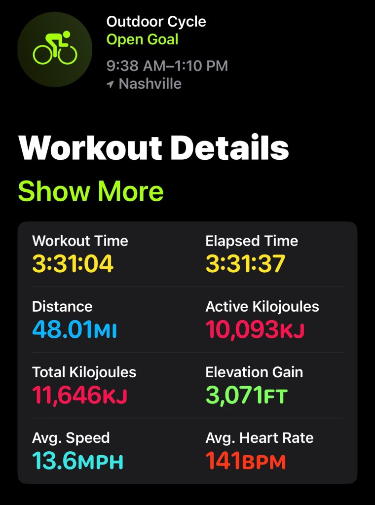 The MapMyRide app gives different results due I think to spotty ATT coverage here in East Nashville.