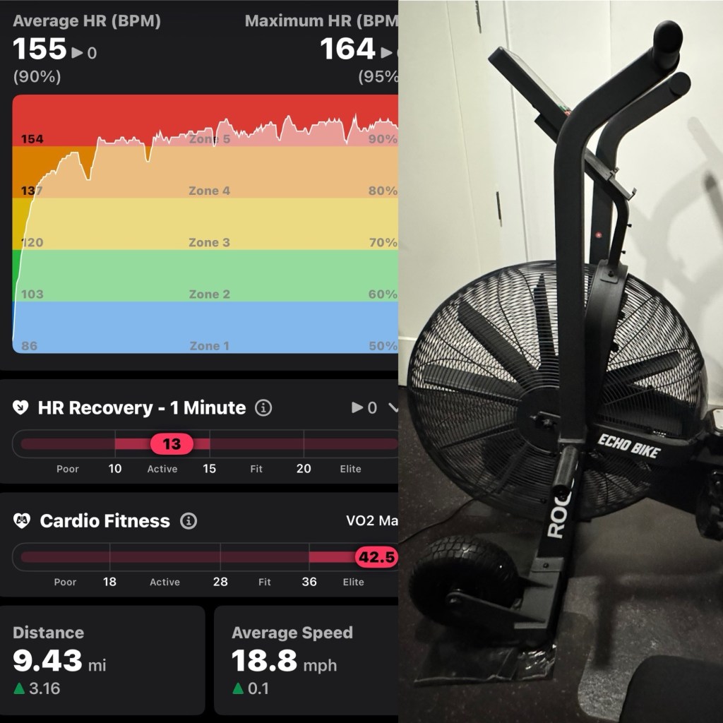 Too much wind for me today plus the threat of some rain so I stayed inside on the AirBike. Not a day for setting Personal Bests — I’m less than a mile behind where I want to be over 30 minutes of pedaling.