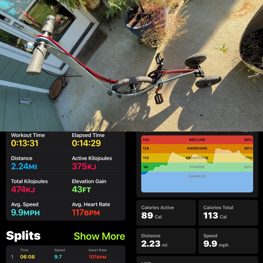 I avoided changing gears out of self-preservation but got in my longest ride yet — 5.06 miles in 30 minutes. The gurus at Halfbike.com told me how to adjust the gearing. We will see tomorrow