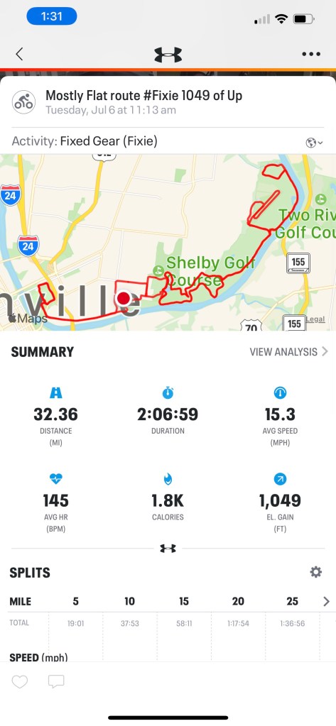 I took out the heavy bike and rode some hills I used to ride in prep for rides to the Dam. There was some wind but the leg — the legs actually — did fine. I’ll work on a better more difficult exit from Shelby to take advantage of these hills.