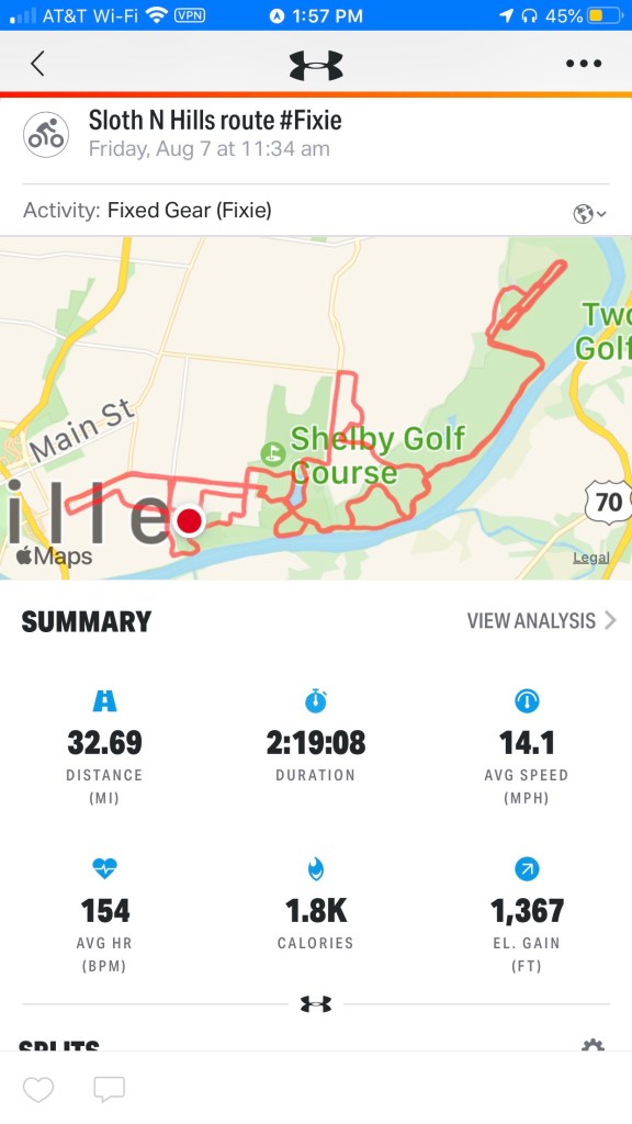 Worked the climbing gear today. Sevier went well plus the connection up Shelby – a lovely double – and up Frisbee Hill. Intentional 32 miles meant no Eastland but the tour of Tornado Acres showed some much-needed rebuilding.